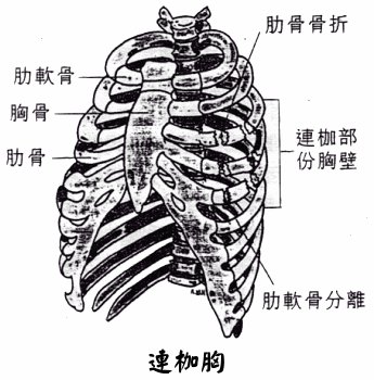 c).治療:多發性肋骨骨折或鏈伽胸,雖可以以止痛藥物,神經阻斷和呼吸治療改善。但嚴重者,除了止痛以外,尚須輔以呼吸器治療才能救命。斷裂的肋骨並不須要手術固定。因鏈伽胸使用呼吸器後,一般5~7天即可脫離。